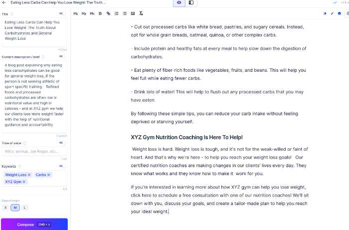 Placing the cursor below my topic, I click the "Compose" button on the bottom left corner of the screen, and Jasper will start writing the post for me.